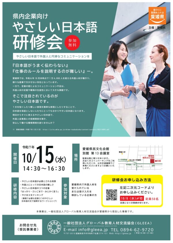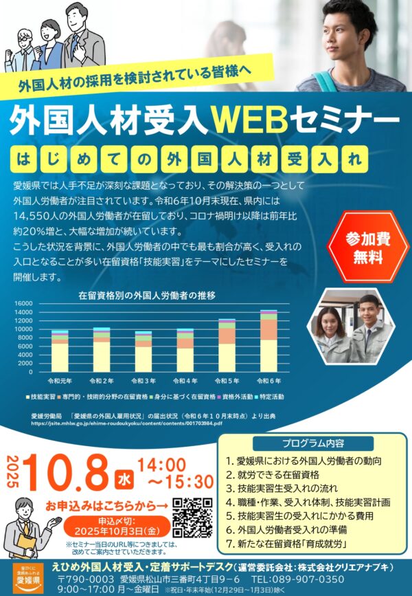 愛媛県では、県内企業における外国人材の受入促進を図るため、技能実習や日本語習得に関するセミナーを開催します。