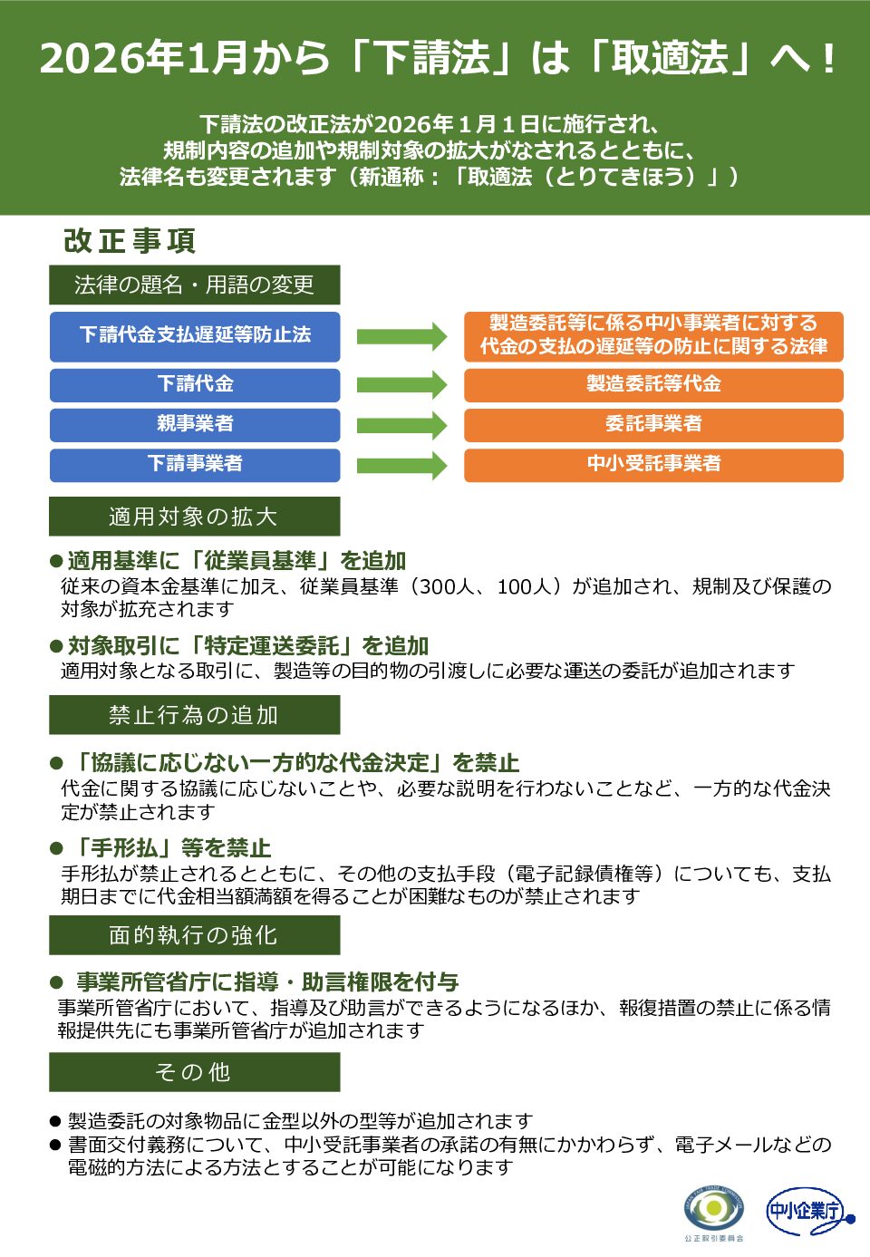 公正取引委員会では、令和8年1月1日施行の改正下請法(新通称:取適法)の周知を図るため、事業者等向けのオンライン説明会を開催します。