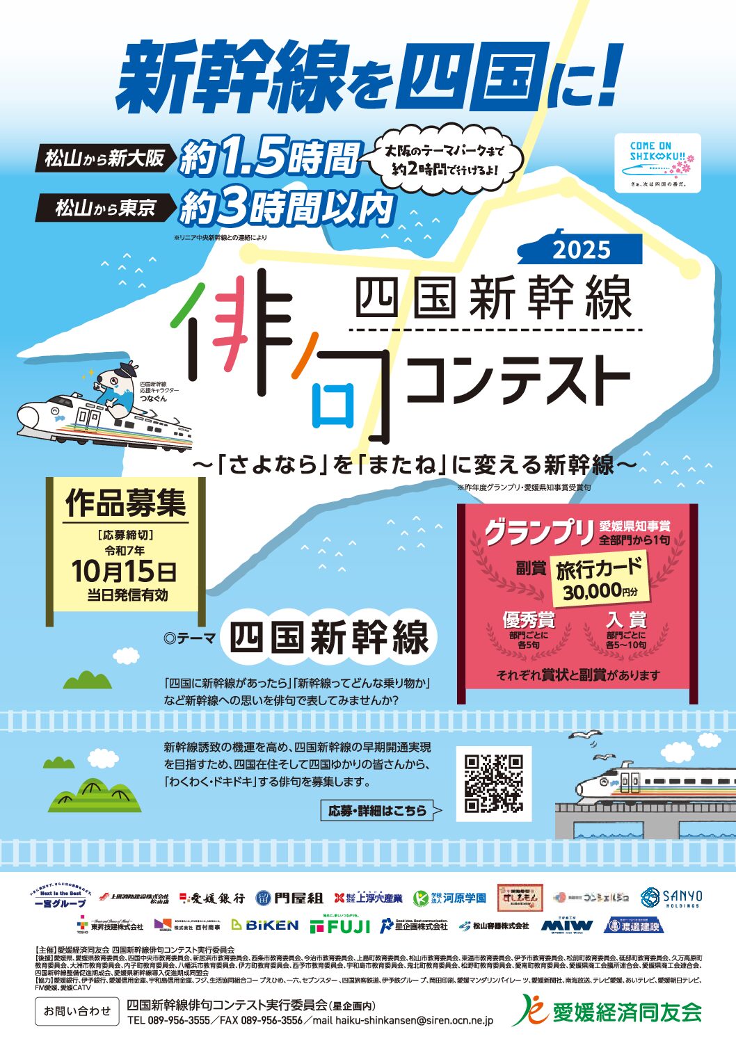 県連からのお知らせ 四国新幹線俳句コンテストの実施について 2025年9月25日掲載 このことについて、愛媛経済同友会より案内がございましたのでお知らせします。 詳細は、関連ファイルをご確認ください。 関連リンク 愛媛経済同友会HP 関連ファイル 【チラシ】四国新幹線俳句コンテスト【ポスター】四国新幹線俳句コンテスト
