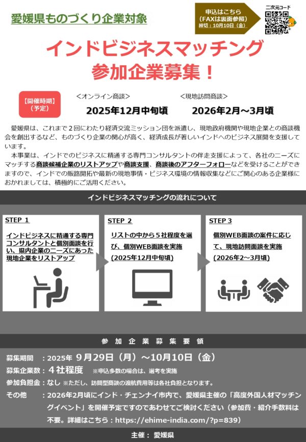 県連からのお知らせ 「インドビジネスマッチング」参加企業募集について 2025年10月2日掲載 愛媛県では、過年度の経済交流ミッションでの実績等を踏まえ、インドでのビジネスマッチングを開催します。 詳しくは、関連リンクをご覧ください。 関連リンク 愛媛県ホームページ申込み専用フォーム 関連ファイル チラシ・申込書
