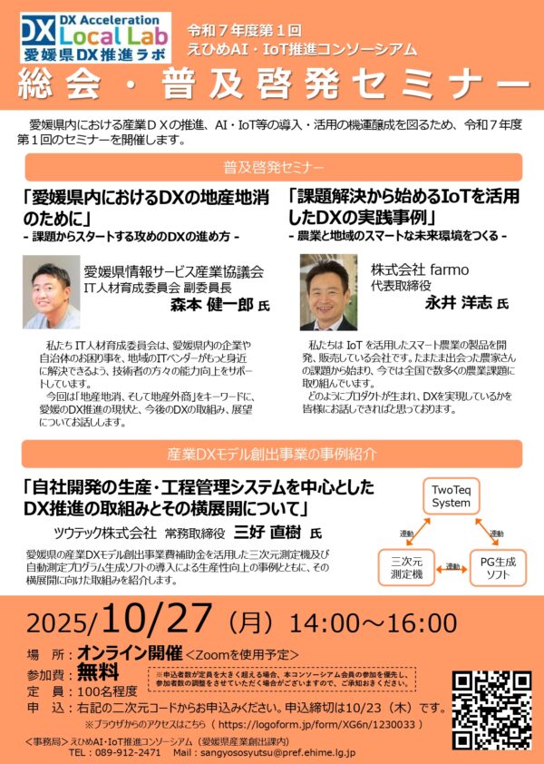 県連からのお知らせ 「令和7年度第1回えひめAI・IoT推進コンソーシアム総会・普及啓発セミナー」の開催について 2025年10月2日掲載 愛媛県では、県内企業の産業DXやAI等の活用促進を図るため、普及啓発セミナーを開催します。(コンソーシアム会員以外も参加可能) 開催日時:令和7年10月27日(月)14:00~16:00 詳しくは、関連リンクをご覧ください。 関連リンク 愛媛県ホームページ申込みフォーム 関連ファイル チラシ