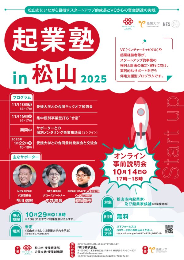 県連からのお知らせ 「起業塾in松山2025」の開催について 2025年10月7日掲載 松山市では、松山市内の起業家等を対象に、ビジネスプランのブラッシュアップ支援を行います。 詳しくは、関連リンクをご覧ください。 関連リンク 松山市ホームページ参加申込フォーム 関連ファイル チラシ