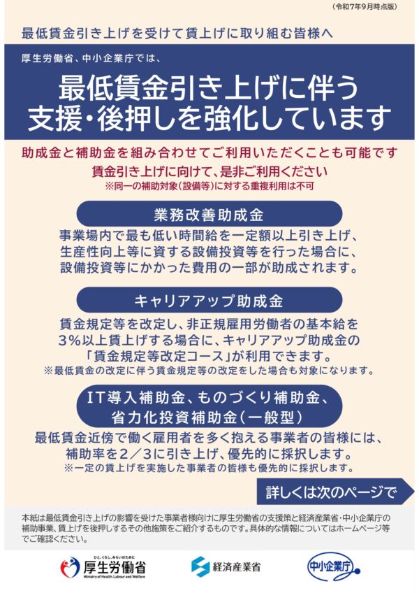 中小企業庁等では、過去最大となった今般の最低賃金引上げに対応する中小企業・小規模事業者への支援の強化を図るため、新たな対応策も含めた各種事業を実施しています。