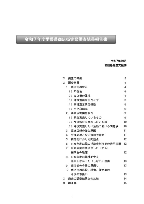 県連からのお知らせ 令和7年度愛媛県商店街実態調査について 2025年10月21日掲載 愛媛県では、県内市町に所在する商店街の実態調査を行い、結果報告書を公表しました。 詳しくは、関連リンクをご覧ください。 関連リンク 愛媛県ホームページ 関連ファイル 令和7年度愛媛県商店街実態調査結果報告書