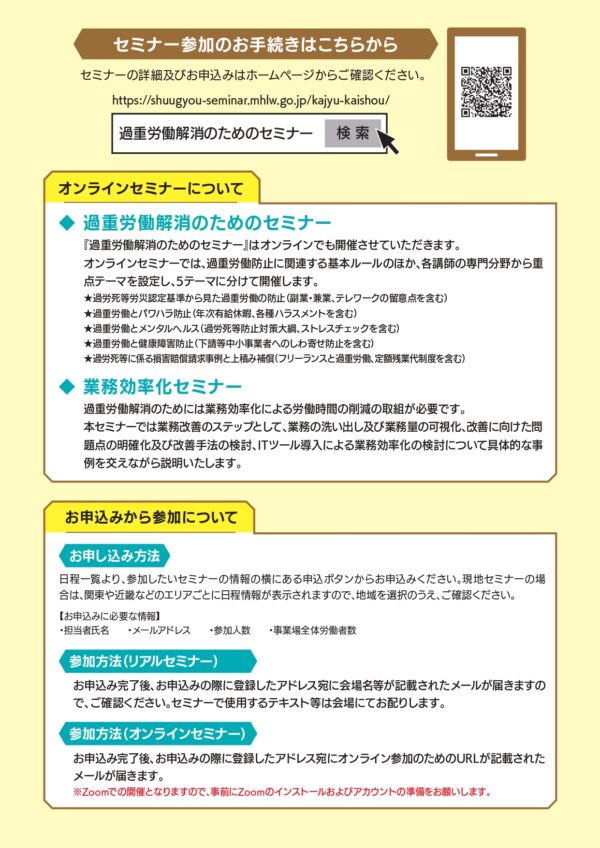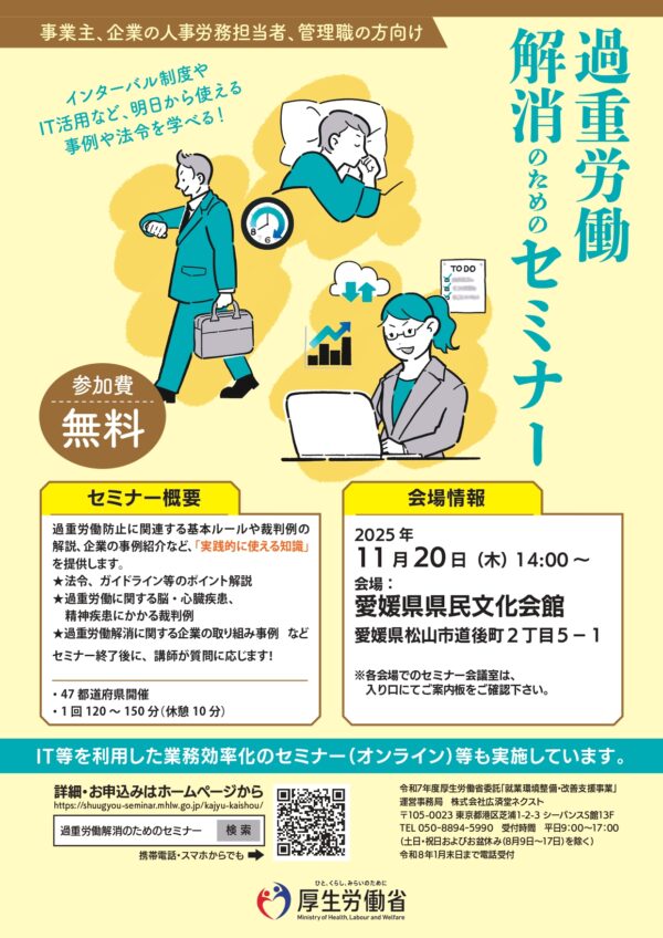 厚生労働省では、過重労働の解消に向け、基本ルールや裁判例の解説、取組事例の紹介など、実務セミナーを開催します。