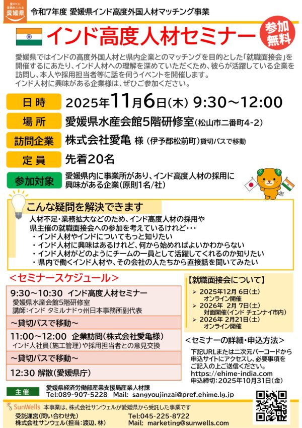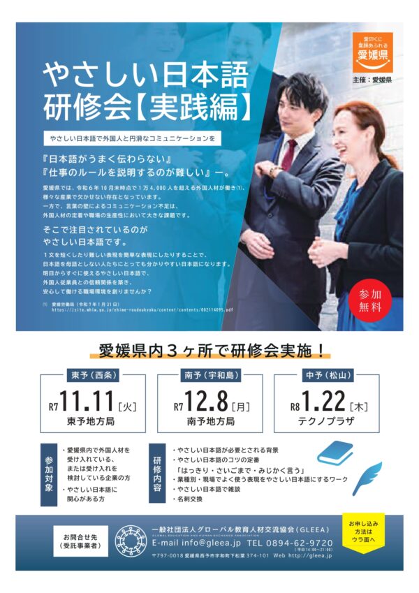 愛媛県では、県内企業における外国人材の受入・定着促進を目的としたセミナーを開催します。