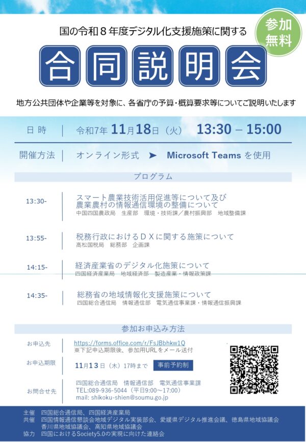 四国経済産業局では、四国総合通信局とともに、令和8年度に実施を予定しているデジタル化関連施策の概要説明をオンラインで行います。