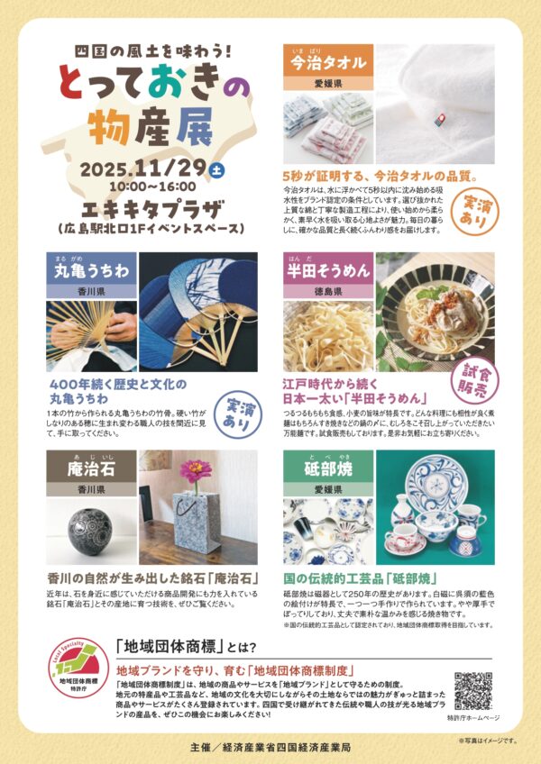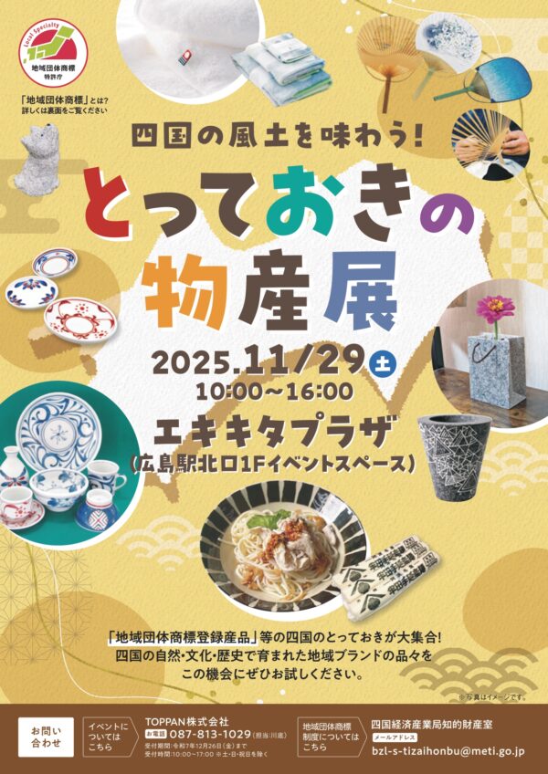 四国経済産業局では、地域団体商標制度の普及促進を図るため、管内の関連商品の販売会を開催します。