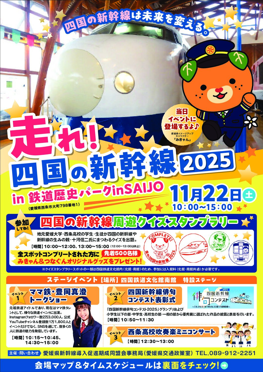 県連からのお知らせ 「走れ!四国の新幹線2025」の開催について 2025年11月14日掲載 このことについて、愛媛県より案内がございましたのでお知らせします。 詳細は、関連ファイルをご確認ください。 関連リンク 愛媛県庁HP 関連ファイル 【チラシ】走れ!四国の新幹線2025