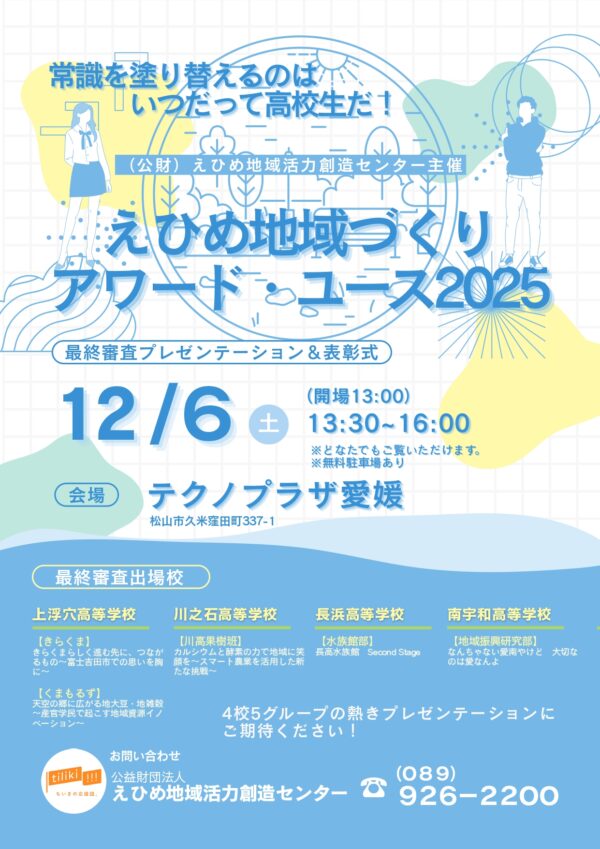 県連からのお知らせ 「えひめ地域づくりアワード・ユース2025」の開催について 2025年11月17日掲載 えひめ地域活力創造センターでは、高校生が主体的に取り組む地域活性化事業の普及を図るため、先進事例の発表会を開催します。 開催日:令和7年12月6日(土) 13:30~16:00 関連リンク 事業ページ 関連ファイル 案内チラシ