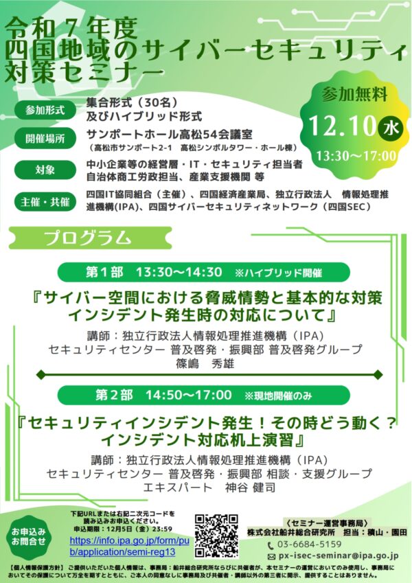 県連からのお知らせ 「令和7年度 四国地域のサイバーセキュリティ対策セミナー」の開催について 2025年11月18日掲載 四国経済産業局及び四国IT協同組合では、近年増加する中小企業を狙うサイバー攻撃の現状と対策について、ワンストップで学ぶセミナーを開催します。 開催日:令和7年12月10日(水) 13:30~17:00 詳しくは、関連リンクをご覧ください。 関連リンク 事業ページ 関連ファイル 案内チラシ