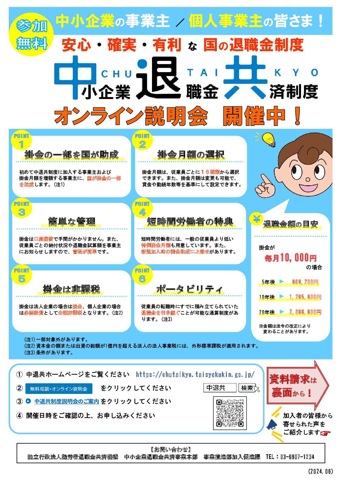 (独)勤労者退職金共済機構では、中小企業退職金共済(中退共)制度の加入を検討されている方向けに、制度のメリットや注意点などを説明するオンライン説明会を実施しています。