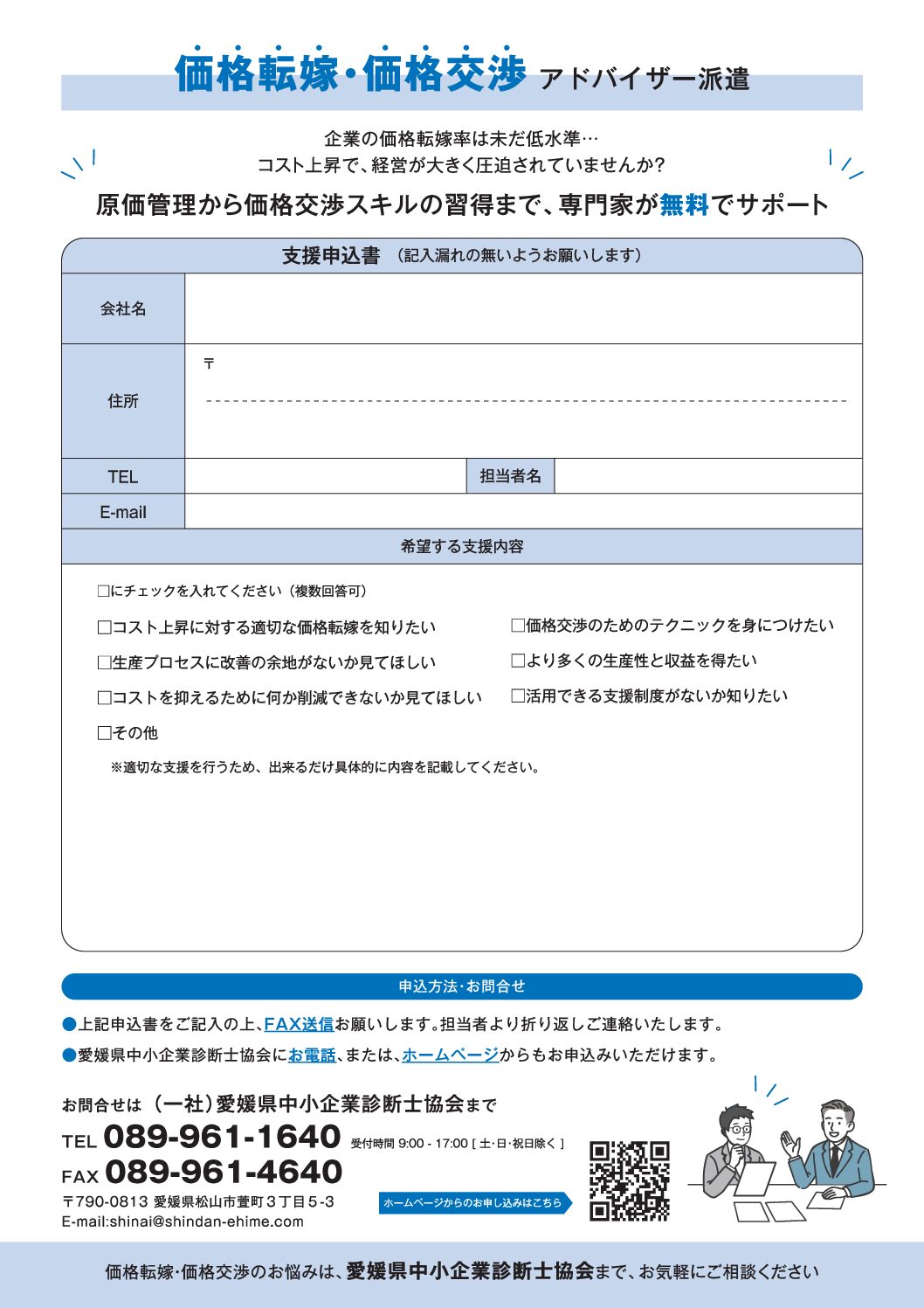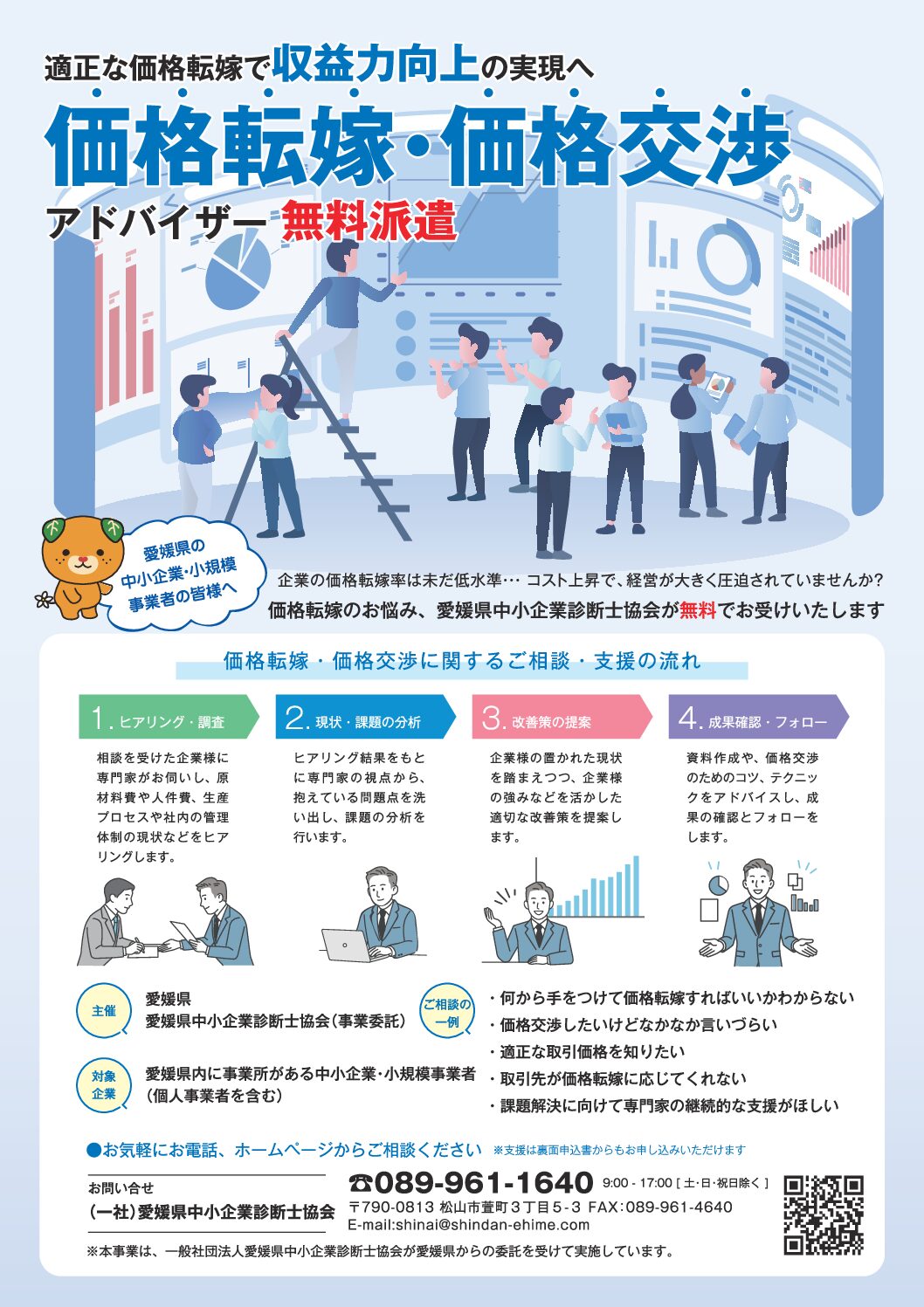 (一社)愛媛県中小企業診断士協会では、県内中小企業等の価格転嫁に向けた取り組みに対し、企業経営の専門家である中小企業診断士による伴走支援を行います。