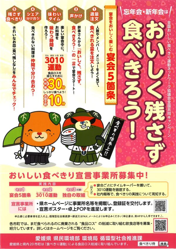 県連からのお知らせ 令和7年度「おいしい食べきり」キャンペーンの実施について 2025年12月8日掲載 愛媛県では、食品ロス削減の一環として、外食機会が多い年末年始の時期に、「おいしい食べきり」の普及啓発を図っています。 詳細は、関連ファイルをご確認ください。 関連リンク 愛媛県ホームページ 関連ファイル 【チラシ】令和7年度「おいしい食べきり」キャンペーン