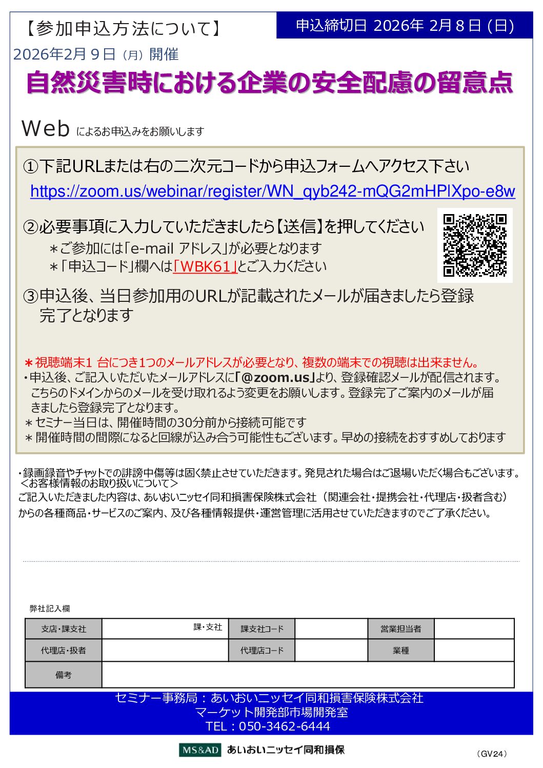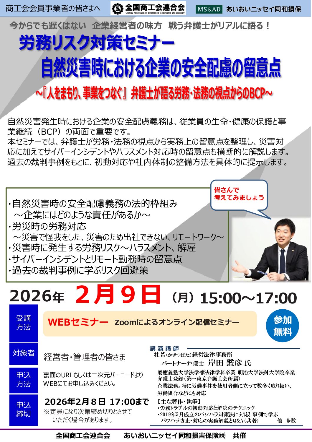 自然災害時の安全配慮義務、労務対応、ハラスメント、サイバーリスク対応等について解説するセミナーを、全国商工会連合会とあいおいニッセイ同和損害保険(株)の連携によりWEB形式で開催いたします。