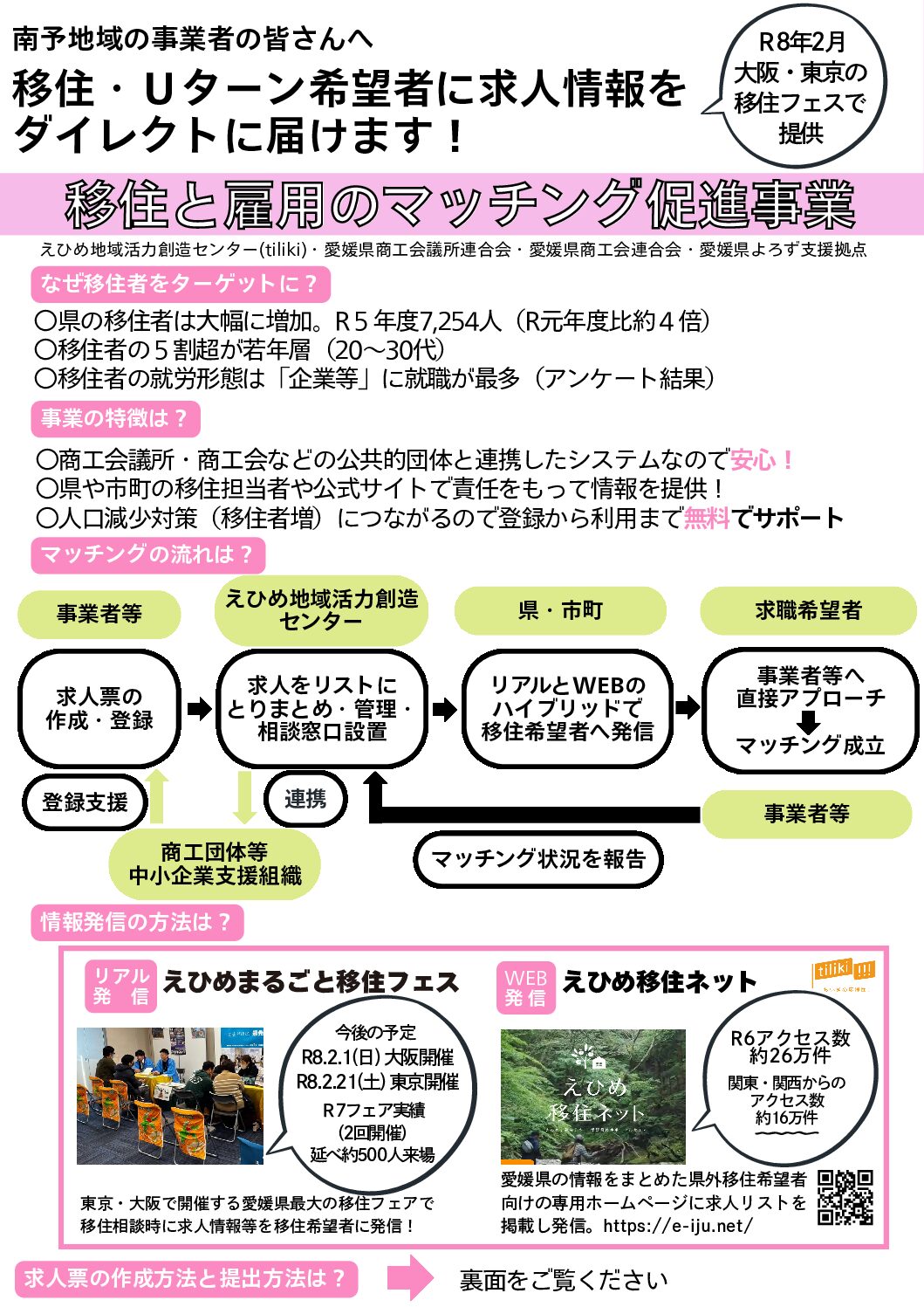 公益財団法人えひめ地域活力創造センターでは、南予地域における移住と雇用のマッチングを促進するため、商工団体の会員事業者等による県外の求職者(移住希望者)向け求人情報の発信を支援しています。