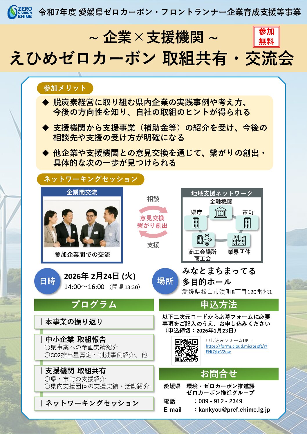 愛媛県では、県内企業と企業支援を行っている団体(自治体・金融機関・商工会など)による、脱炭素に係る取組共有・交流会を実施します。