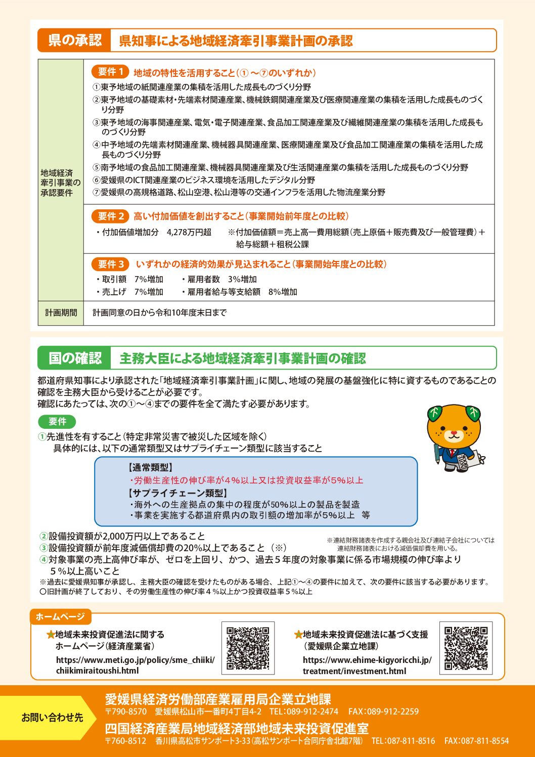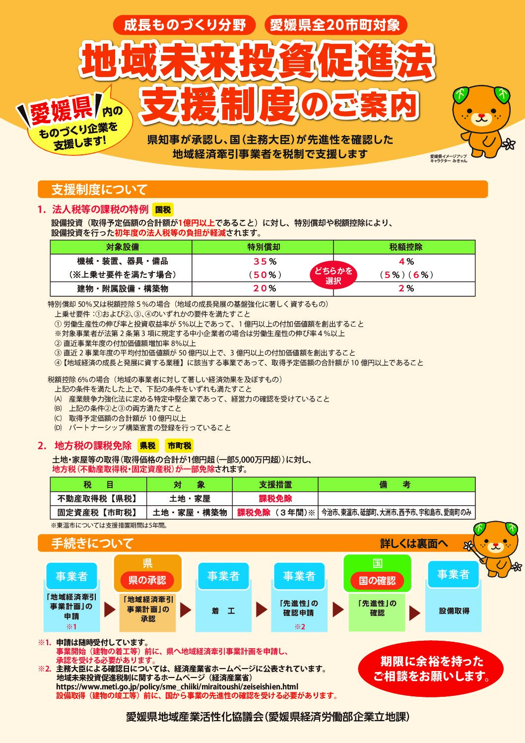 県連からのお知らせ 地域未来投資促進法支援制度について 2025年12月23日掲載 愛媛県では、地域経済を牽引する事業者への承認とともに、税制面での支援を行います。 詳しくは、関連リンクをご覧ください。 関連リンク 愛媛県企業立地情報ポータルサイト経済産業省ホームページ 関連ファイル 案内チラシ