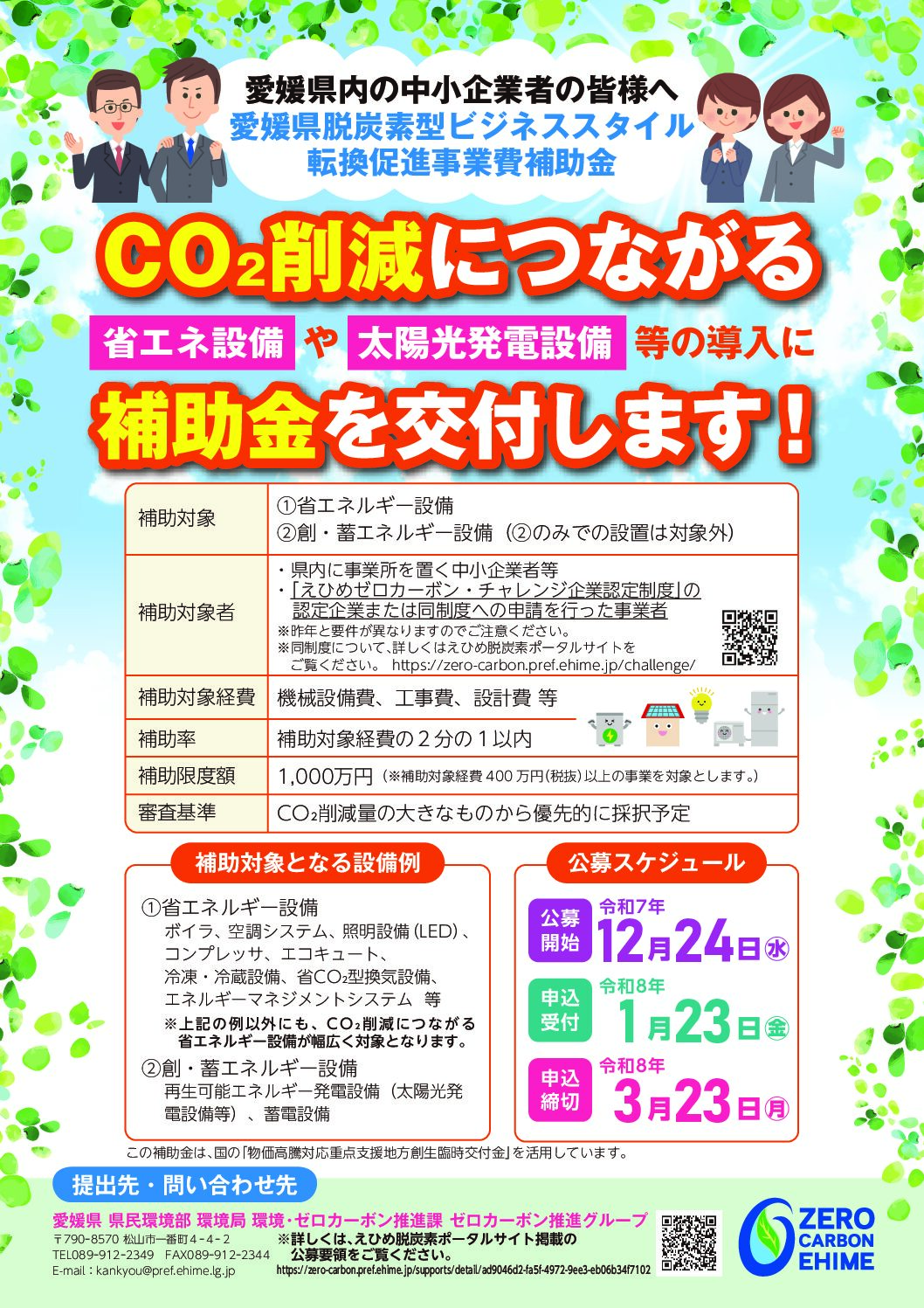 県連からのお知らせ 令和7年度愛媛県脱炭素型ビジネススタイル転換促進事業費補助金の公募開始について 2026年1月7日掲載 愛媛県では、脱炭素型ビジネススタイルへの転換を促進するため、CO₂排出量の削減や再生可能エネルギーの創出等につながる中小企業者の設備投資を補助します。 申込締切:令和8年3月23日(月) 詳しくは、関連リンクをご覧ください。 関連リンク 愛媛県ホームページ 関連ファイル 募集チラシ