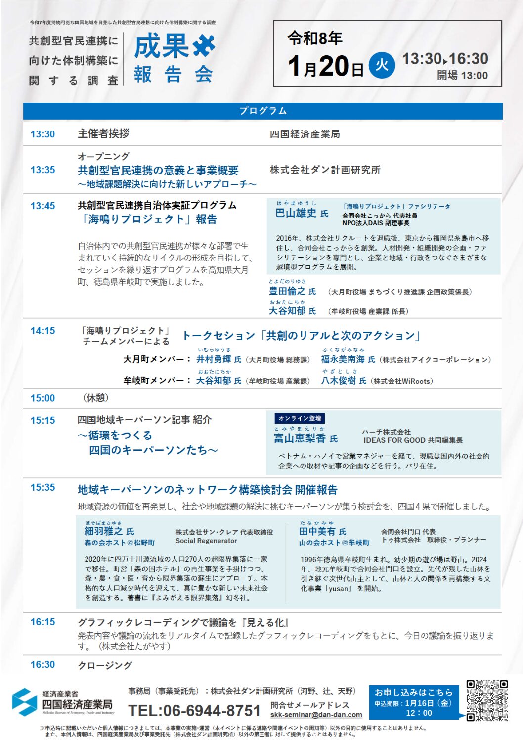 四国経済産業局では、自治体単独では解決が難しい地域課題に対して官民が課題やアイデアを共有し、共に解決策を創り上げる「共創型官民連携」を推進しており、本調査に関する成果報告会を開催します。