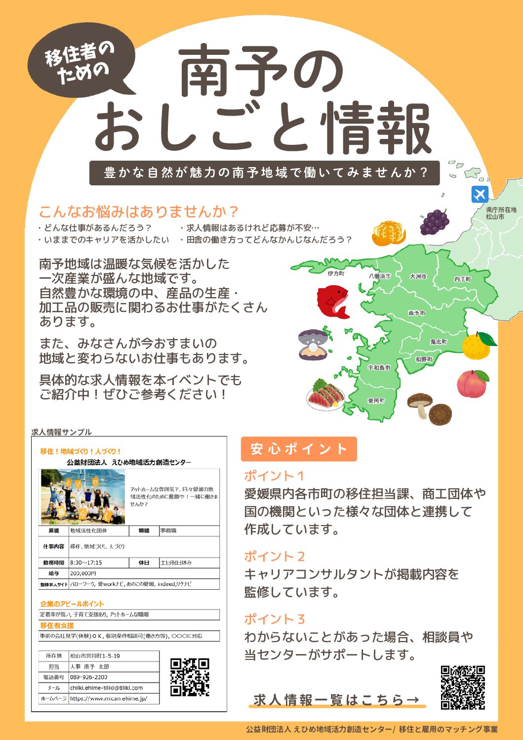 公益財団法人えひめ地域活力創造センターでは、南予地域における移住と雇用のマッチングを促進するため、県外の求職者(移住希望者)向け求人情報を発信しています。