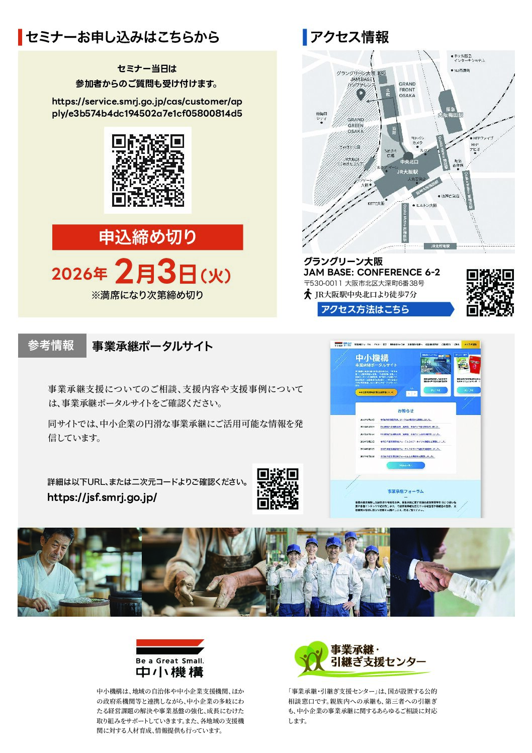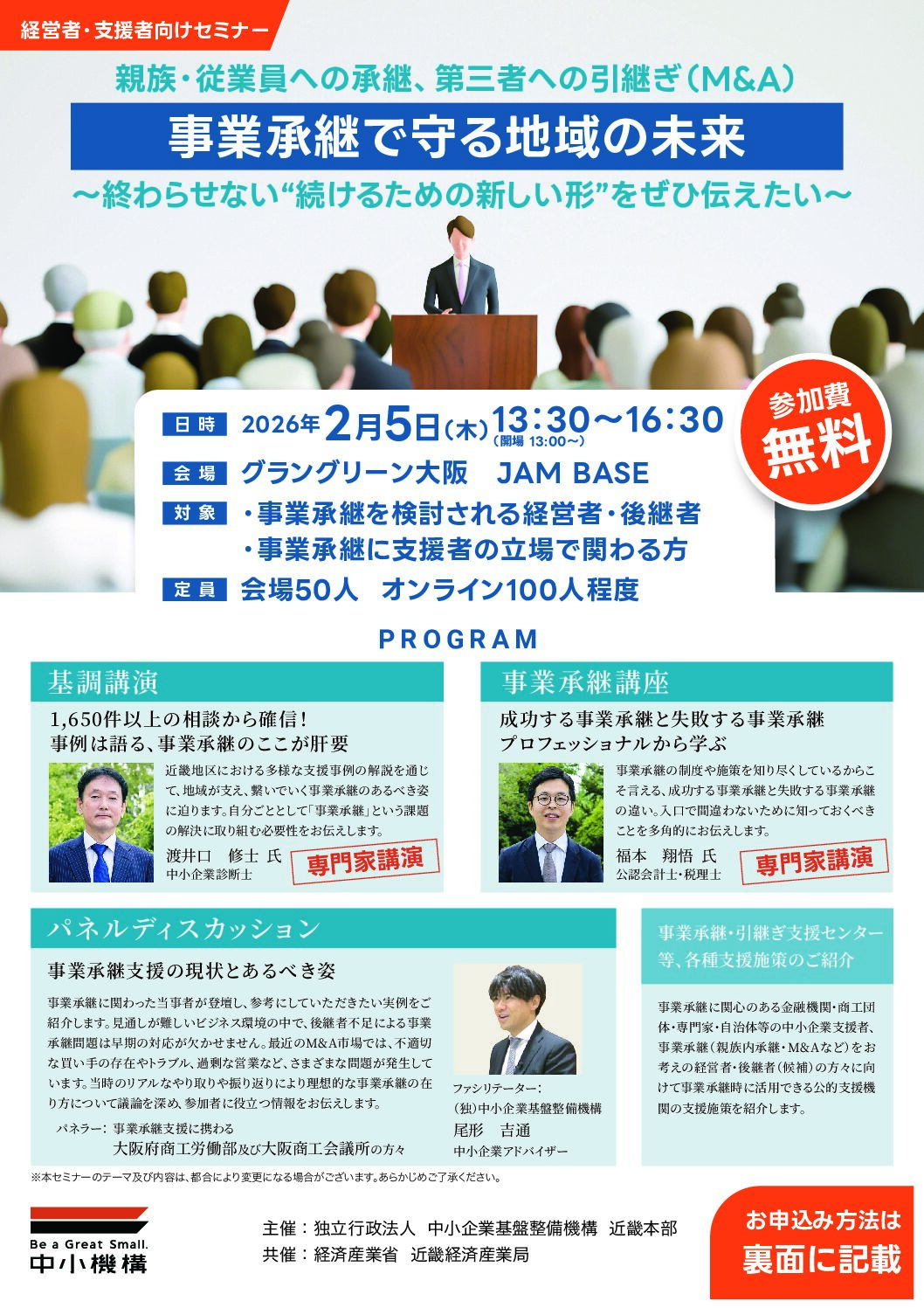 中小機構近畿本部では、親族・従業員への事業承継及び第三者への引継ぎ(M&A)の成功事例の紹介とともに、普及啓発を図ります。
