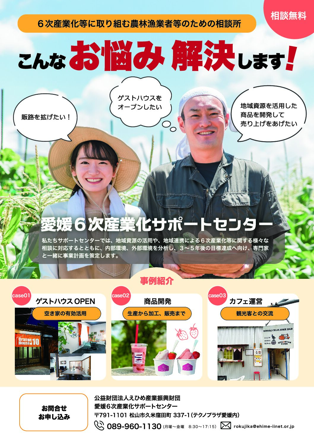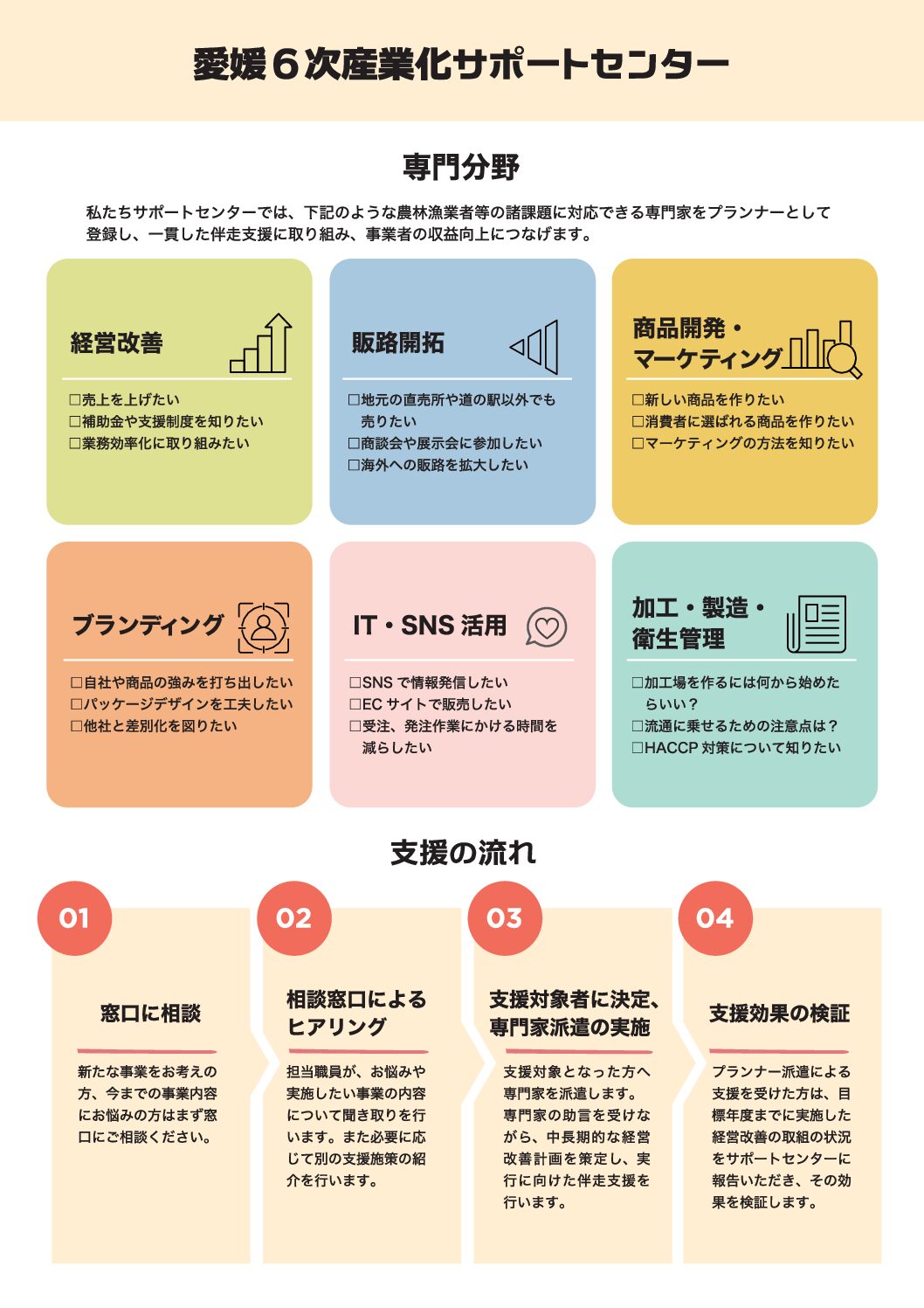 県連からのお知らせ 愛媛6次産業化(地域資源活用・地域連携)サポートセンターの設置について 2026年2月10日掲載 愛媛県では、農林漁業者等の地域資源活用・地域連携による新たな価値創出の取組を支援するため、相談窓口を設置しています。 詳しくは、関連リンクをご覧ください。 関連リンク 愛媛県ホームページ 関連ファイル 案内チラシ
