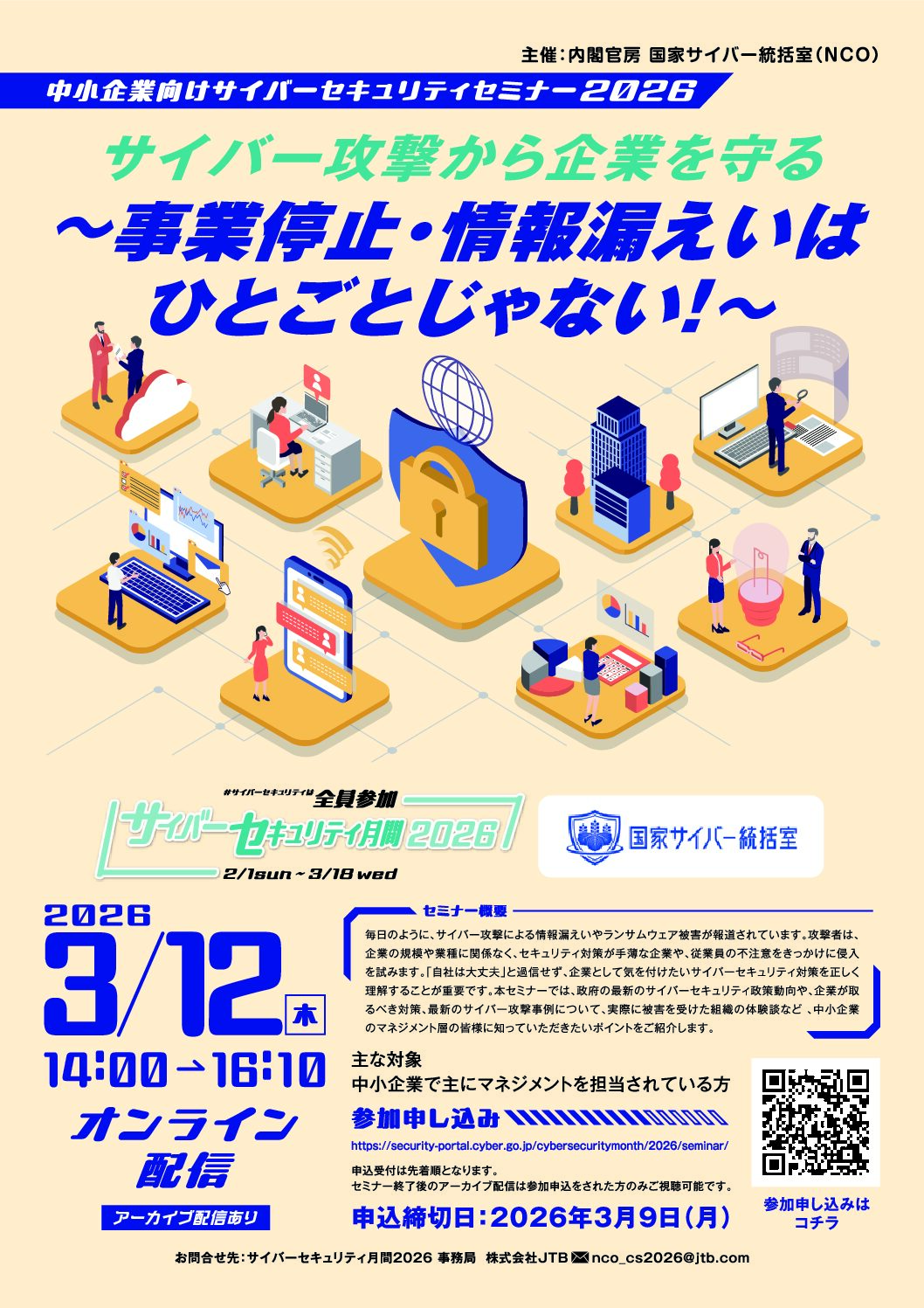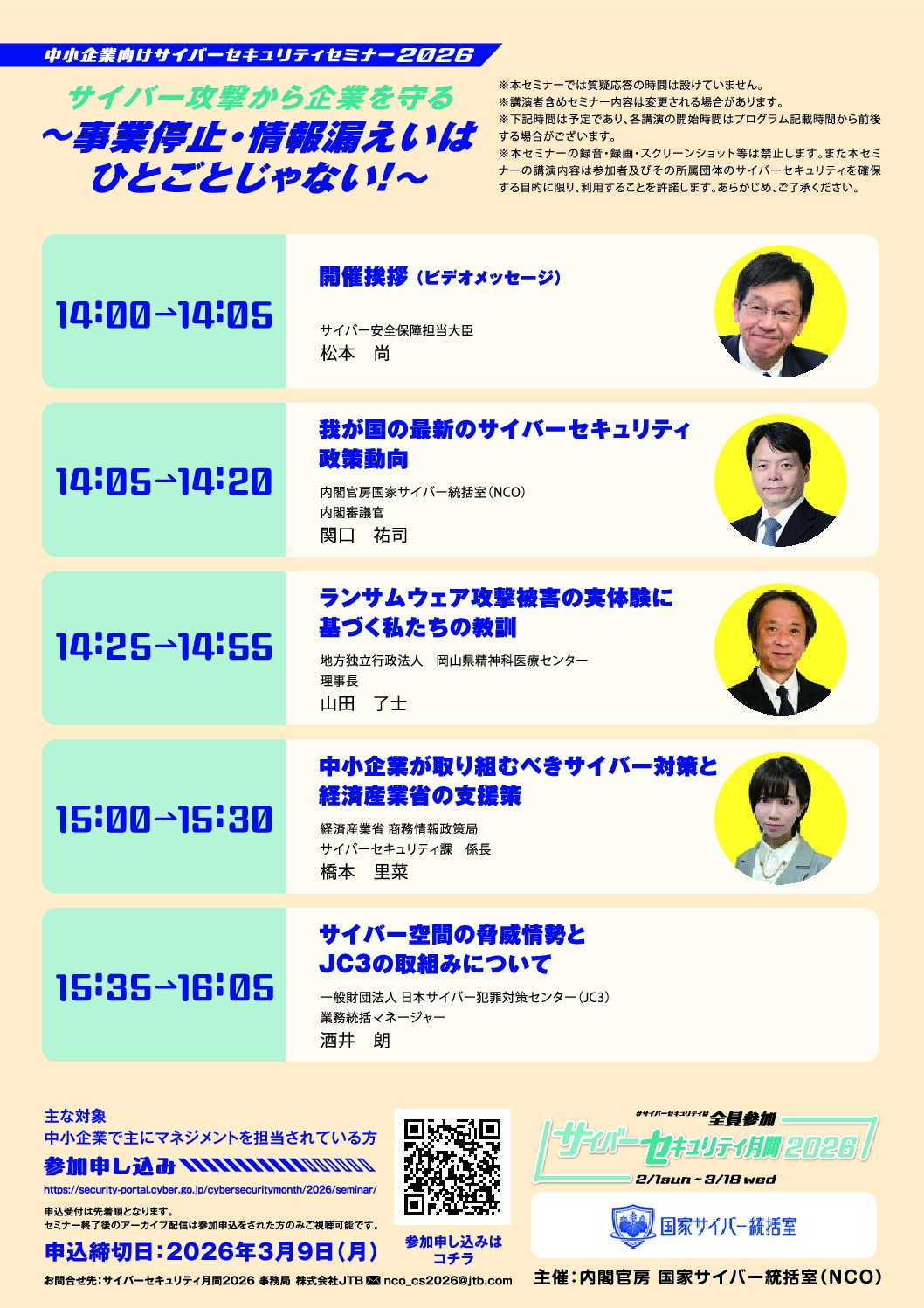 内閣官房国家サイバー統括室では、中小企業向けに政府の最新のサイバーセキュリティ政策動向や、企業が取るべき対策、最新のサイバー攻撃事例について実例を交えながら紹介します。