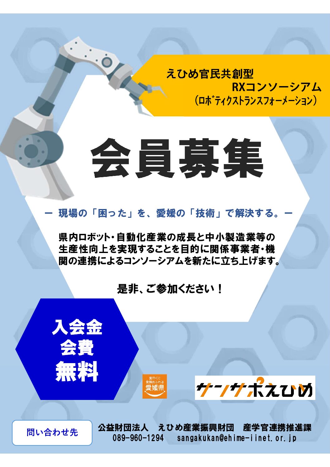 公益財団法人えひめ産業振興財団では、県内ロボット産業の成長と生産性向上による人手不足解消等を図るため、コンソーシアムを立ち上げるとともに、会員事業者を募集します。