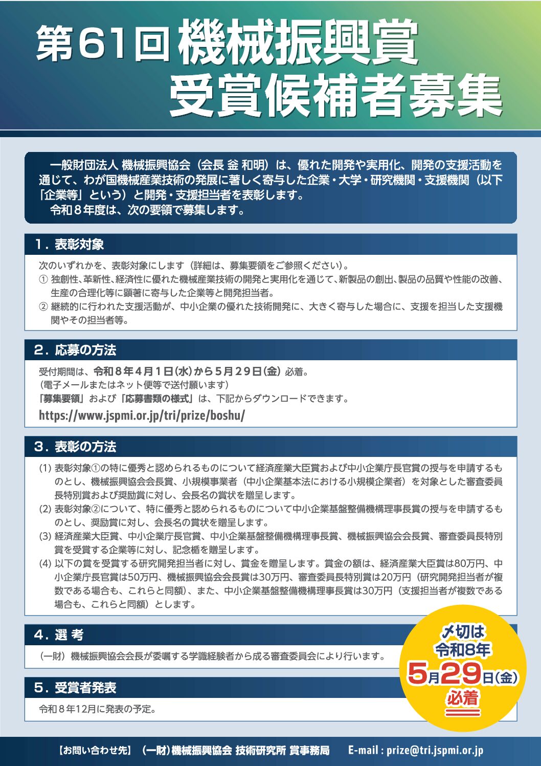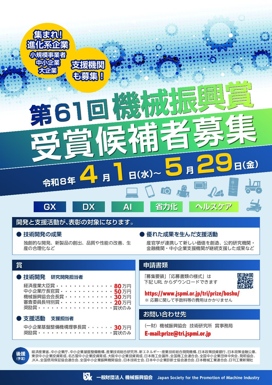 一般社団法人機械振興協会では、機械産業技術の発展に著しく貢献した企業や研究機関等の表彰事業を実施しています。