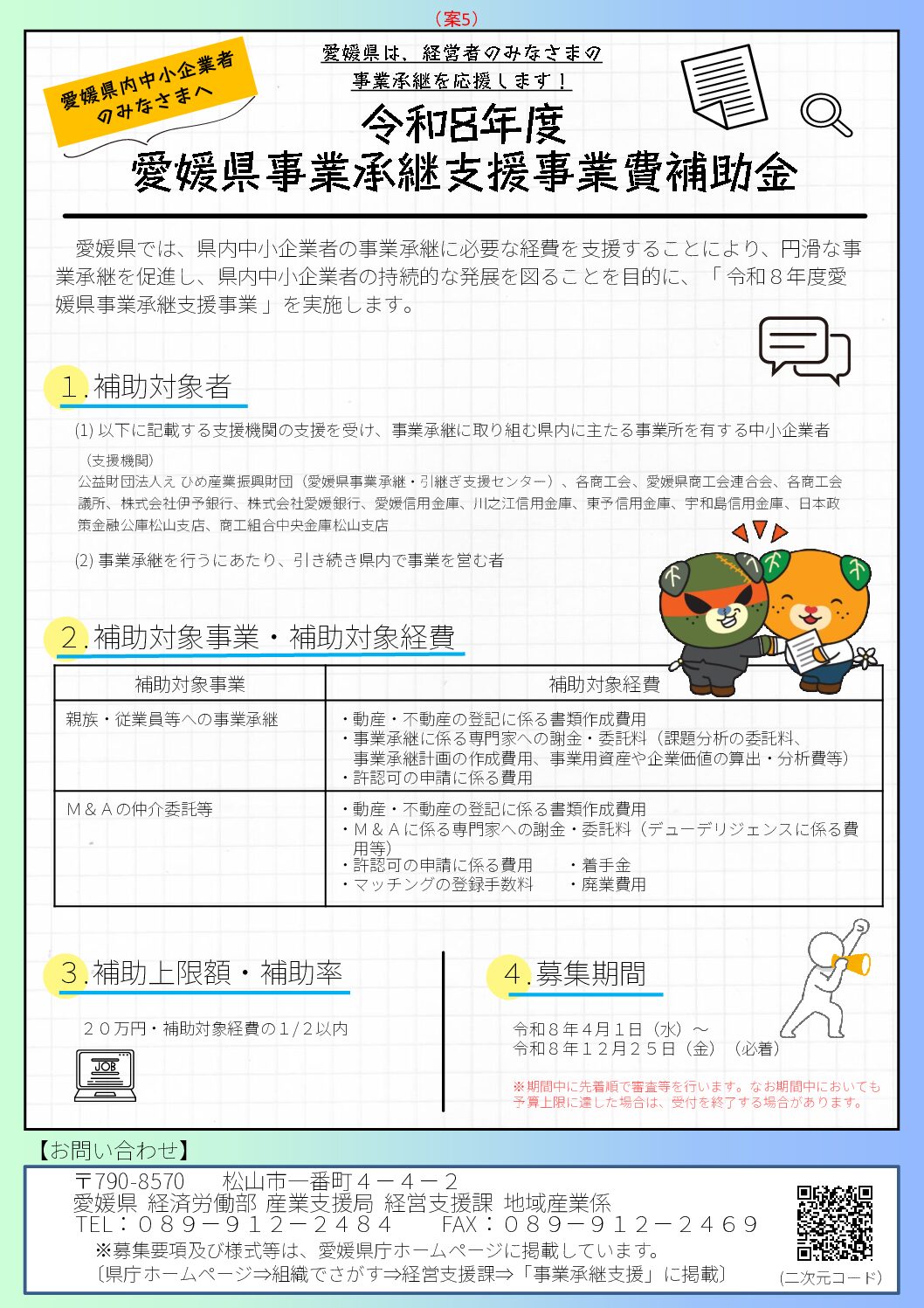 県連からのお知らせ 令和8年度愛媛県事業承継支援事業の募集について 2026年4月10日掲載 愛媛県では、県内中小企業者の円滑な事業承継を促進するため、承継に伴う専門家謝金や手数料等を補助します。 募集締切:令和8年12月25日(金) 詳しくは、関連リンクをご覧ください。 関連リンク 愛媛県ホームページ 関連ファイル リーフレット募集要項交付要綱