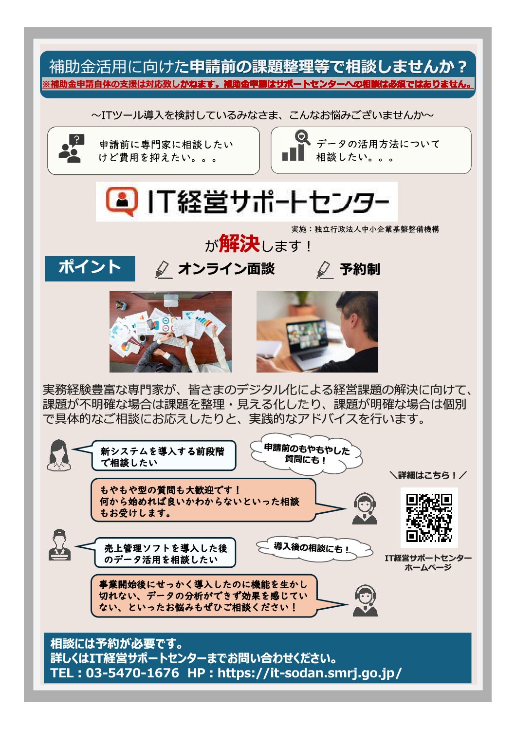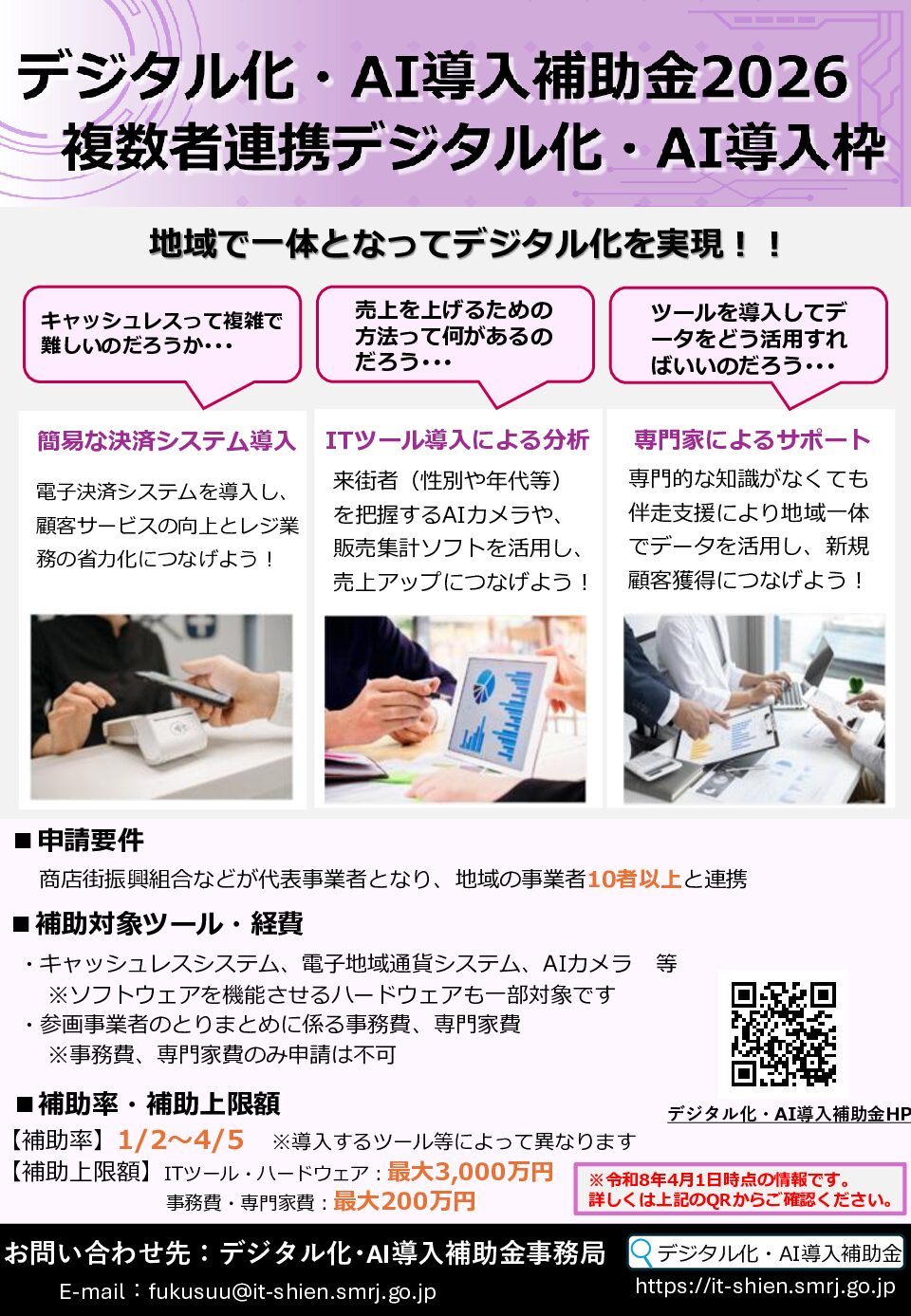 県連からのお知らせ デジタル化・AI導入補助金(複数社連携デジタル化・AI導入枠)の公募について 2026年4月13日掲載 中小企業庁では、複数の中小・小規模事業者が連携した地域DX の実現や生産性の向上を図る取組に対して、複数者へのIT ツールの導入等を支援します。 <公募期間> 1次締切:令和8年6⽉15日(月) 17:00まで 2次締切:令和8年8⽉25日(火) 17:00まで 詳しくは、関連リンクをご覧ください。 関連リンク 補助金ホームページ 関連ファイル リーフレット