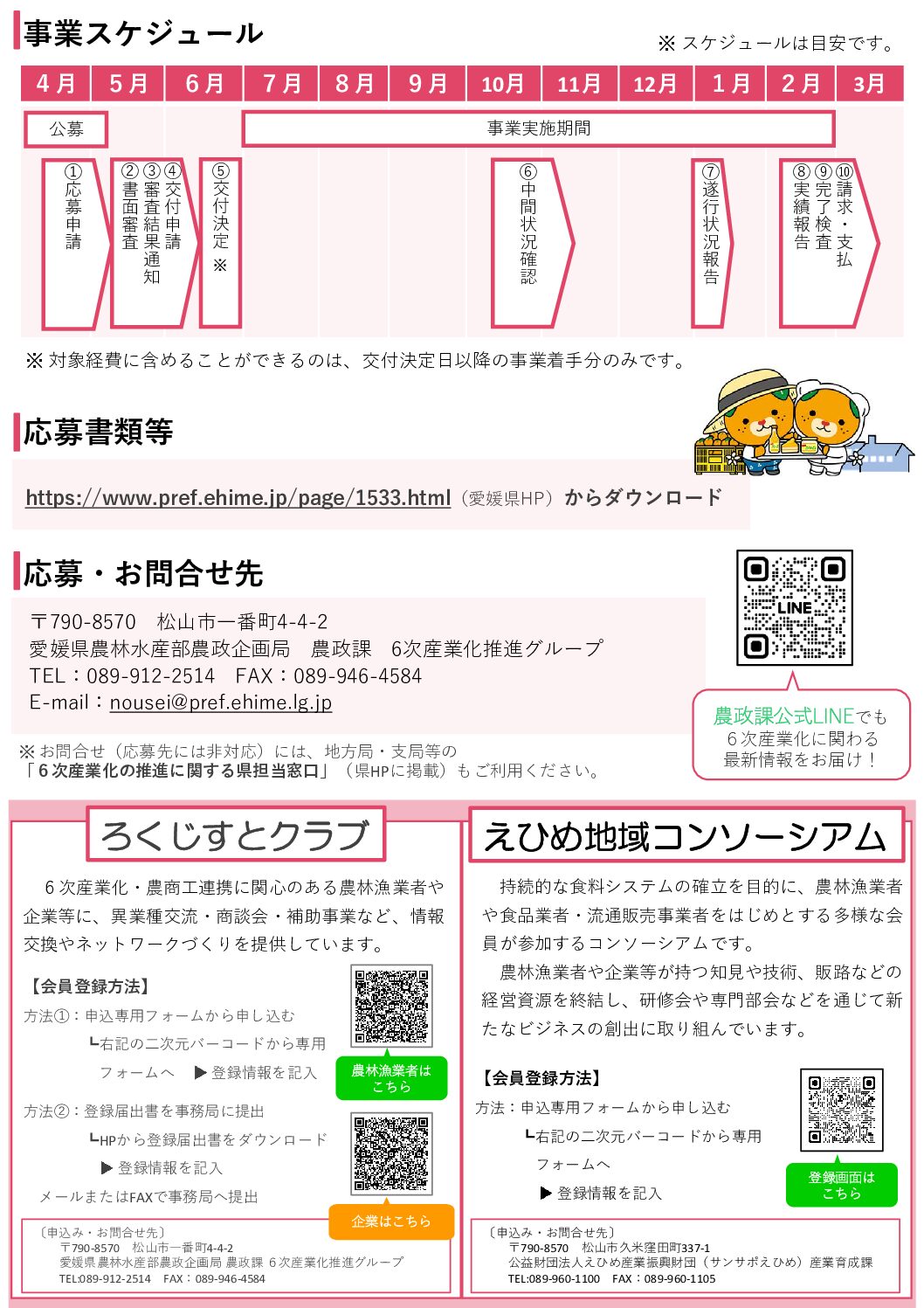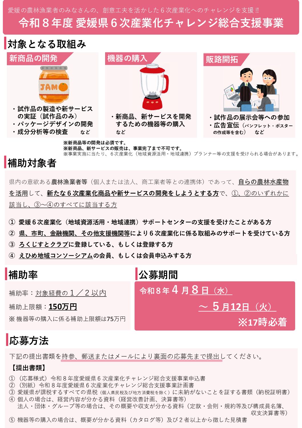 県連からのお知らせ 令和8年度愛媛県6次産業化チャレンジ総合支援事業の公募について 2026年4月27日掲載 愛媛県では、6次産業化に取り組む農林漁業者等の育成支援を図るため、商品開発などへの経費を補助します。 応募締切:令和8年5月12日(火) 詳しくは、関連ファイルをご覧ください。 関連リンク 愛媛県ホームページ 関連ファイル 公募要領案内リーフレット