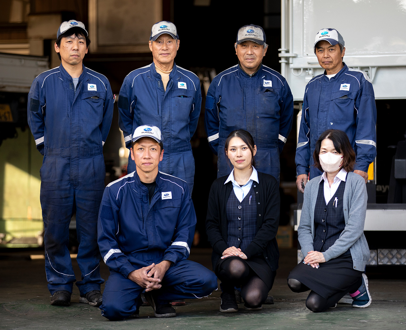 西予市宇和町の国道56号沿いに事務所兼工場を構える「有限会社松葉モータース」は、昭和40年(1965)の創業から現在まで地域密着型の経営を続けてきました。高い技術力ときめ細やかなサービスが評価され、業績が堅調に推移する中、創業60周年の節目を迎えた令和7年(2025)10月、創業以来初となる事業承継に踏み切りました。創業者からバトンを受け継ぎ2代目に就任したのは、男性従業員の中で最年少となる40歳の井上剛さん(前列左端)。これまで会社経営の経験はありませんが、持ち前の若さと行動力を武器に大きな一歩を踏み出した井上さんに、新代表に就任した経緯や今後の目標などについて話を伺いました。